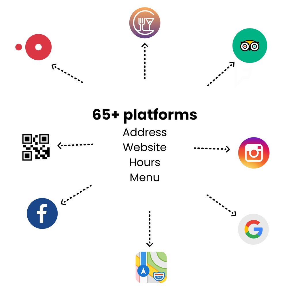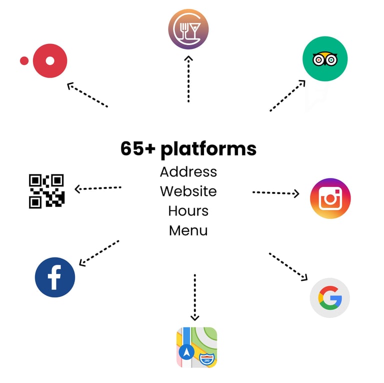 65+ different platforms. This means you'll be covered on 99% of internet traffic looking for your restaurant. The big ones we sync to that are going to bring in the most traffic are Google, Facebook, Yelp, Tripadvisor, Apple Maps, Bing, OpenTable, and 60 more.