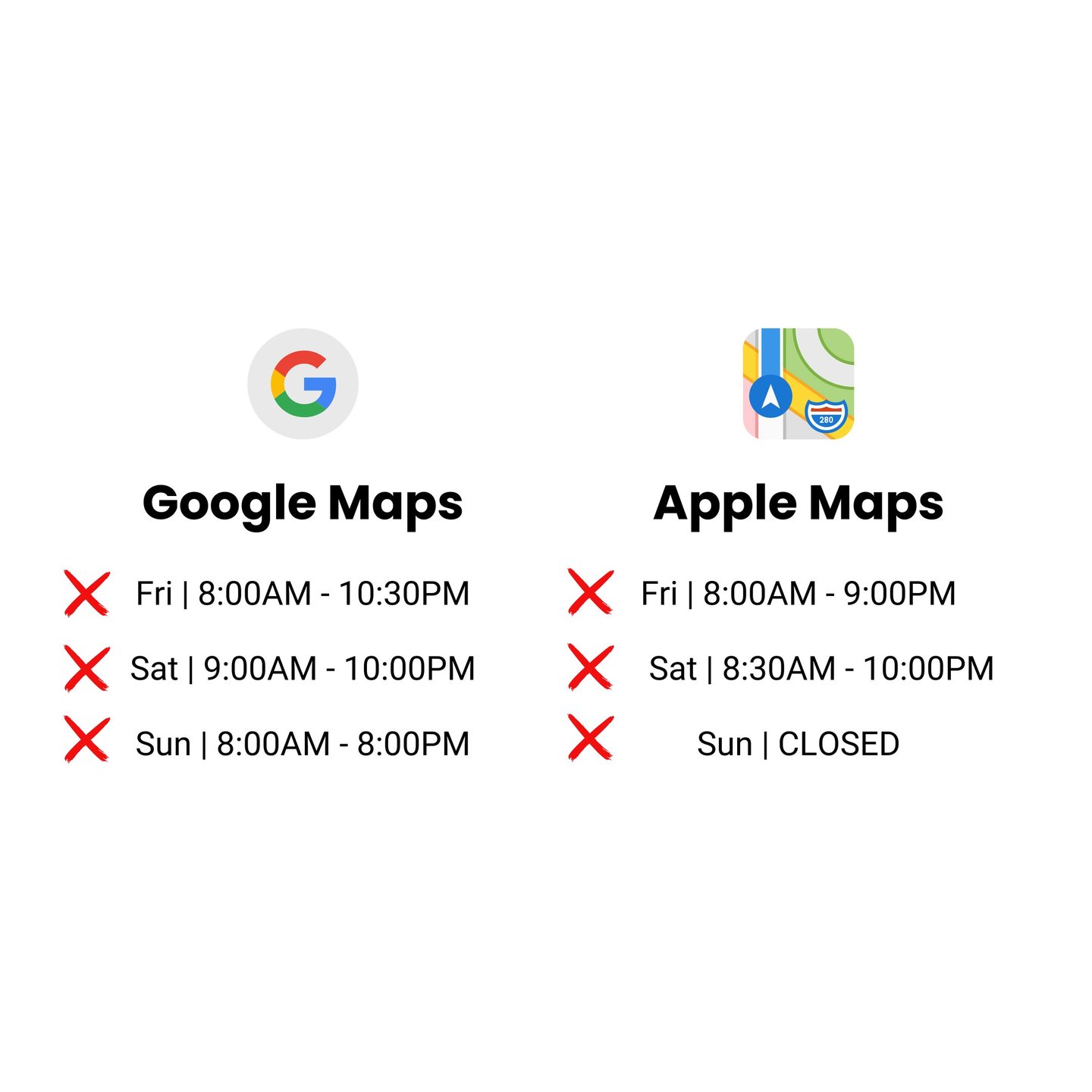 Your customers don't know what is true and not true. If they show up at your restaurant when Yelp says you're open but you're actually closed, they'll probably leave you a 1 star review. And even worse - Google showing you as closed when you're actually open causes people to not show up at your restaurant.