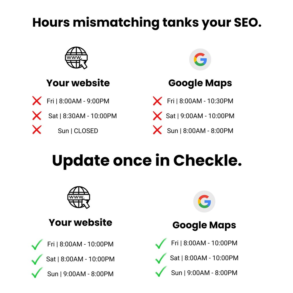 We build your site in 7 days. When you need to update your hours, your menu, or your holiday schedule, you do it once in Checkle and it syncs to your website and your Google Business profile automatically.