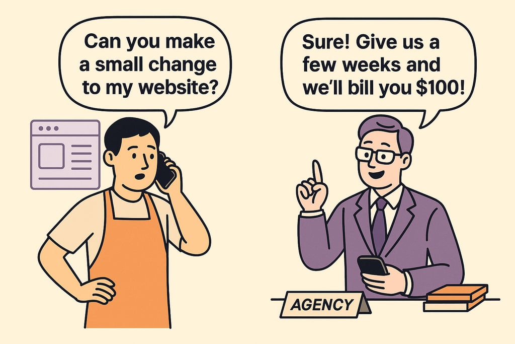Now when you need to change your holiday hours — a 5-minute fix — they charge you $150 and take two weeks to respond. You're paying $300-500/month for a website that doesn't even sync to Google Maps.